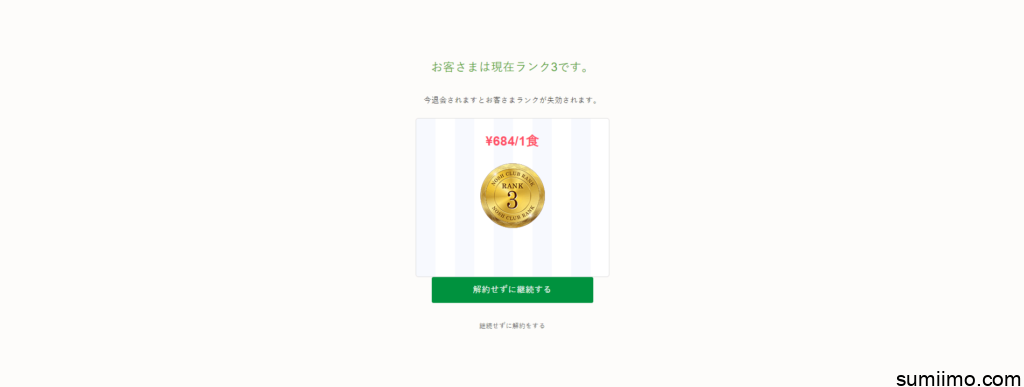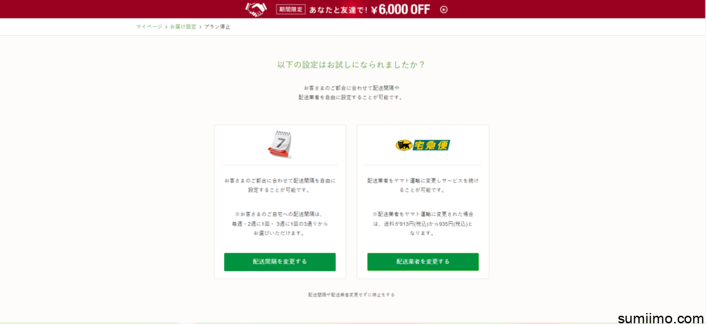 【停止】マイページの左下「プランを停止する」→ ランクの下の緑ボタンの下の「継続せず停止する」→ 「配送間隔や配送業者変更せず停止する」 クリック。